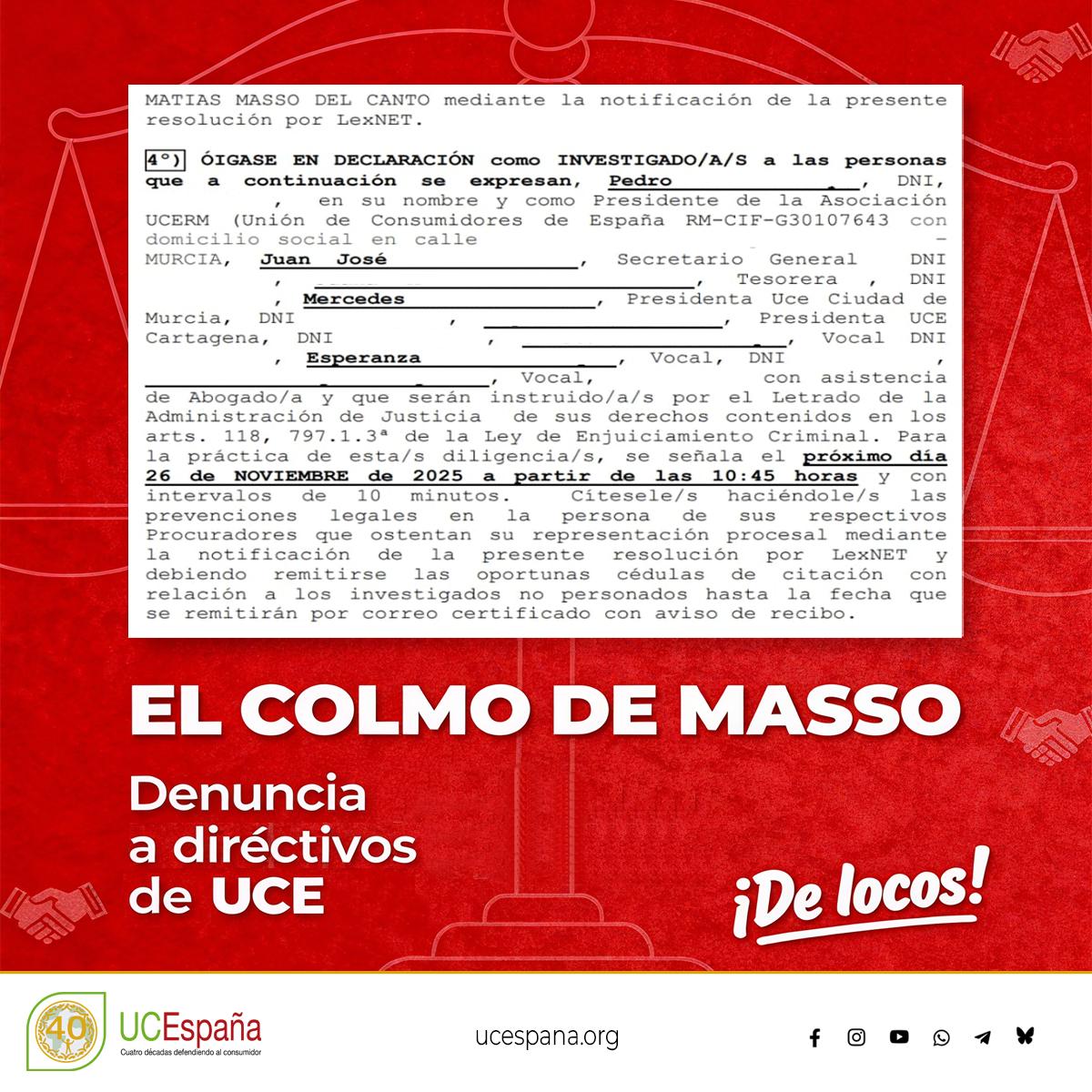 La Unión de Consumidores de España en la Región de Murcia (UCERM) ha recibido notificación judicial para comparecer en calidad de investigada en un procedimiento promovido por Matías Massó del Canto, abogado del médico imputado en el caso de la fallecida Sara Gómez, a raíz de las publicaciones y acciones de advertencia realizadas por la organización.