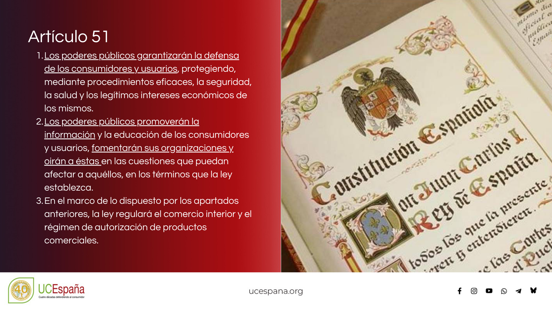 El Día de la Conmemoración de la Constitución Española no es solo un recuerdo, sino una poderosa reafirmaciónde la misión de las asociaciones de consumidores y usuarios. Su trascendental Artículo 51 no es una sugerencia, sino un mandato contundente, claro e imperativo a las administraciones públicas. Su objetivo principal es la garantía y la seguridad de los ciudadanos, pero a él se une un principio igualmente crucial: el FOMENTO ACTIVO DE LAS ORGANIZACIONES DE CONSUMIDORES.